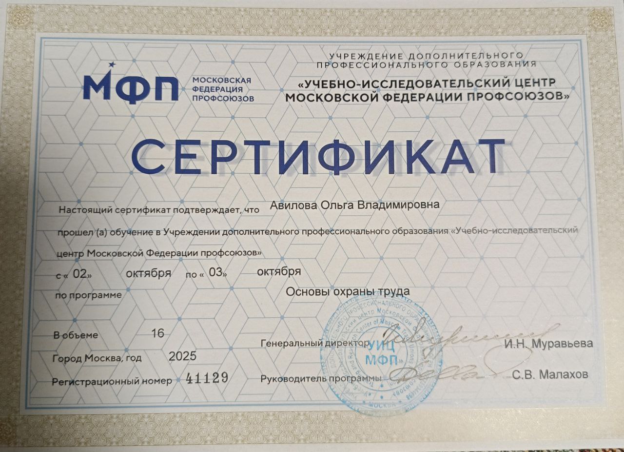 Таким образом, участие нашей коллеги, Авиловой Ольги Владимировны, в данном семинаре является важным вкладом в обеспечение безопасной рабочей среды и соблюдение всех необходимых мер по охране труда в нашем образовательном учреждении.